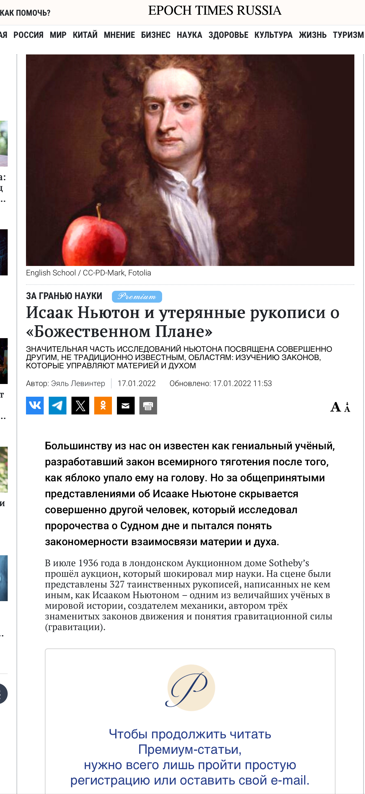 Способ 2. Сайт «Великая Эпоха» позиционирует как обычное СМИ, на первый взгляд, никак не связанное с сектой. Лишь зашкаливающее количество уже знакомой нам псевдомистической лапши, сдобренной антикитайской пропагандой и навязчивой рекламой достоинств «Фалуньгуна», может навести на размышления. Подобные материалы здесь доступны свободно – но вот статьи, искушающие кликбейтными заголовками вроде «Исаак Ньютон и утерянные рукописи о «Божественном Плане» уже требуют регистрации – а для этого «всего лишь» оставить свой е-мейл.