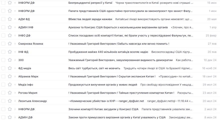 Иногда письма с такими заглавиями улавливаются фильтрами спама, но с энергией, достойной лучшего применения, их авторы регистрируют всё новые почтовые адреса для «донесения Правды». Их тематика делится на два типа: «хоть какая-нибудь гадость о Китае» - и проповедь учения секты Фалуньгун, так что авторство угадывается без труда.